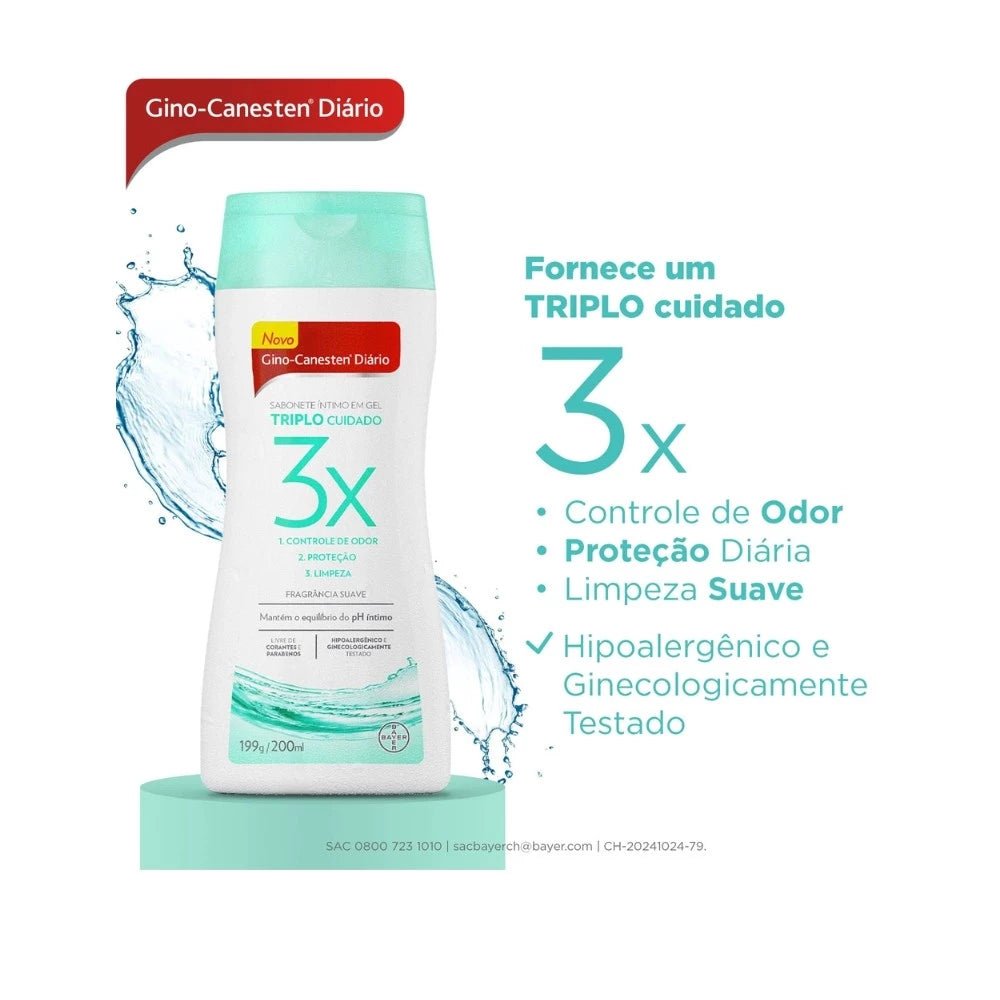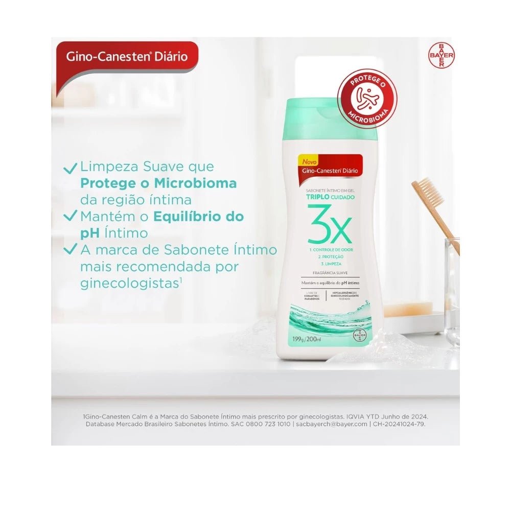 Conteúdo da Embalagem: 1 Sabonete Íntimo Diário Triplo Cuidado 200ml Gino Canesten